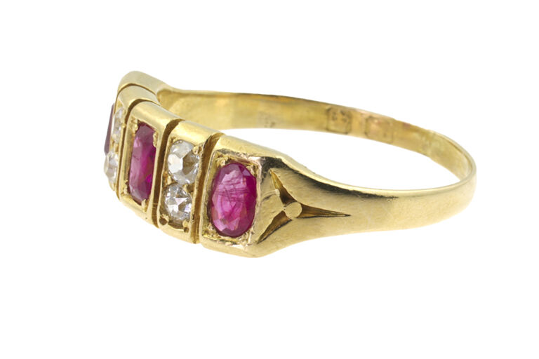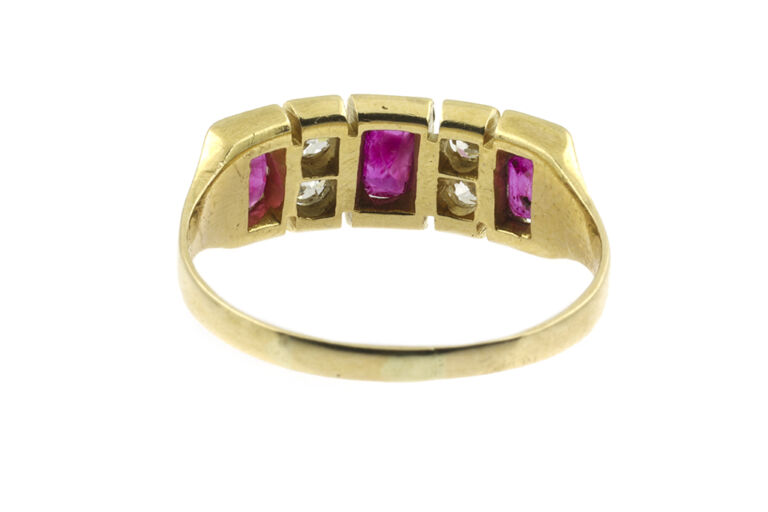 Total ruby (5) weight: 0.35cts. Total diamond weight: 0.09cts. 18ct yellow gold.