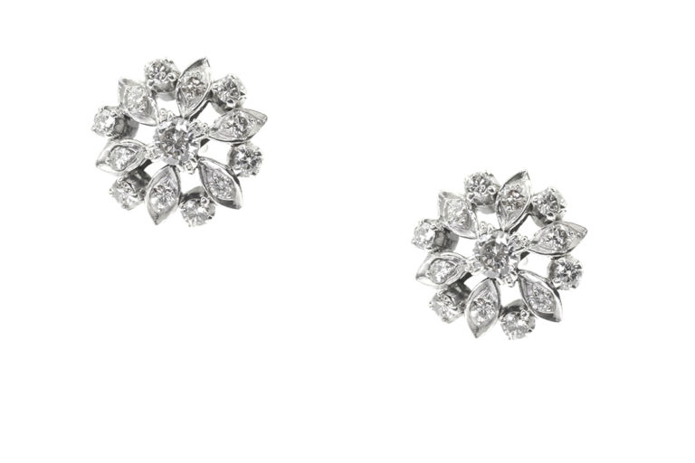 Total diamond weight approximately 1.30cts. French Assay mark. 18ct white gold. Post & scroll ear fittings.