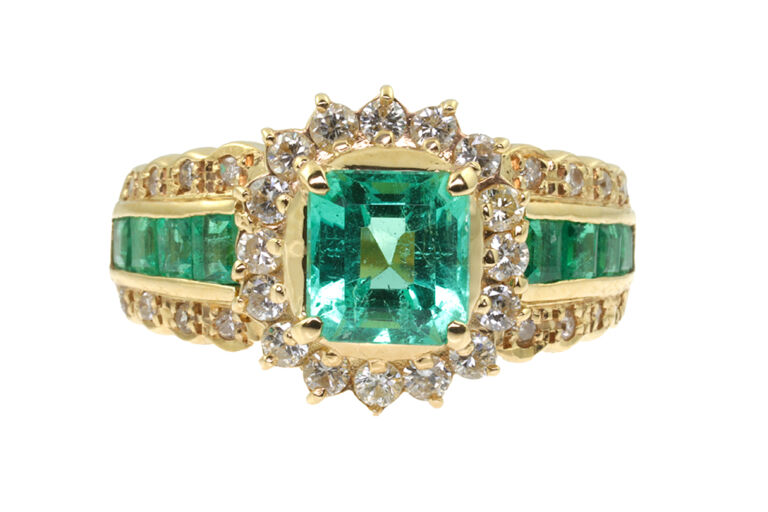Brazilian emerald weight: 0.43cts. Total diamond weight: 0.22cts. 18ct yellow & white gold. Custom made for Studleys Jewellers.