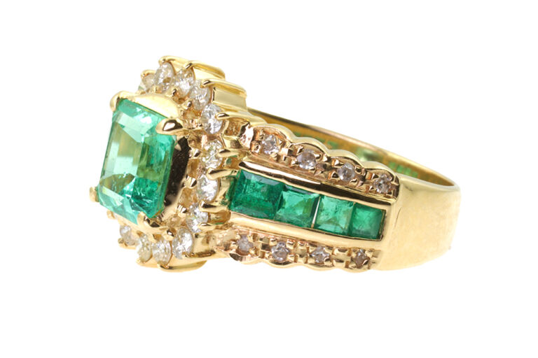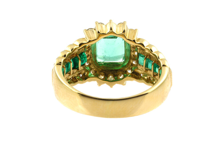 Emerald weight: 0.57cts. Total diamond weight: 0.32cts. 18ct yellow gold. Custom made for Studleys Jewellers.