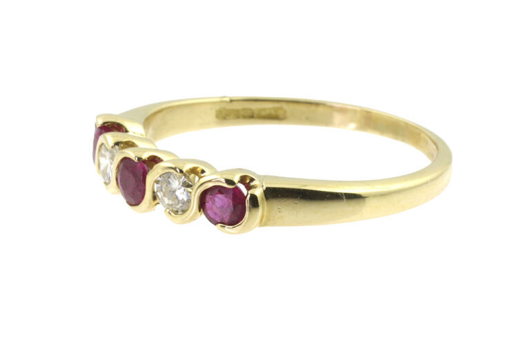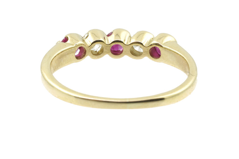 Total ruby (5) weight: 0.35cts. Total diamond weight: 0.09cts. 18ct yellow gold.